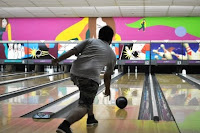 The regulations listed here are generally based around regulations set by the United States Bowling Congress and the British Tenpin Bowling Association. These rules are followed by all sanctioned leagues and events, such as tournaments. This information is clarified by the World Tenpin Bowling Association in its “Statutes & Playing Rules”. The sport of ten-pin bowling is performed on a straight, narrow surface known as a lane. This bowling lane is 60 feet (18.29 m) from the foul line to the head pin (1-pin). About 15 feet (4.57 m) from the foul line are a set of guide arrows. The lane is 41.5 inches (1.05 m) wide and normally consists of 39 wooden boards or a synthetic material. The bowling lane has two sets of approach dots; from the foul line back to the first set of approach dots is about 12 feet (3.66 m) and to the second set of approach dots is about 15 feet (4.57 m) (an additional 3 feet (0.91 m)). Although this figure varies, the lane is protected by about 18 ml of oil. The PBA events use about 30 ml of oil, and the PWBA events use 25 ml. The oil starts from about 4 inches from the foul line and is applied for about 38 feet (11.58 m) down the lane from that point. USBC rules specify that a pin must be 15 inches (38 cm) tall and about 4.7 inches (12 cm) wide at its widest point, where a rolling ball would make contact. There are additional measurements which delineate the shape. The weight of a single pin must be at least 3 pounds, 6 ounces (1.47 kg) and no more than 3 pounds, 10 ounces (1.64 kg). Within a set of ten pins, the individual weights may vary by no more than 4 ounces (113.4 g), if made from wood or plastic coated, or just 2 ounces (56.7 g) if synthetic. The top of the pin shall have a uniform arc with a radius of 1.273 inches (32.3 mm), ± 1/32 inch (31.5 – 33 mm). The USBC also has regulations governing the weight distribution of the pin from top-to-bottom. Pins are allowed one or two “voids” (holes) in the belly area (which can be viewed if the pin is cut in half from top-to-bottom). The voids are needed to balance the narrower top half of the pin with the wider bottom half. Without them, the pins would be too bottom-heavy to fall properly when struck. The pins must show the name and mark of the maker, either “USBC Approved” or “BTBA Approved” and appear uniform. The head pin or 1 pin stands on board 20 of the lane. The circumference of the ball must not be more than 2.25 feet (0.69 m), and the ball cannot weigh more than 16 pounds (7.26 kg). The ball must have a smooth surface over its entire circumference except for holes or indentations used for gripping the ball, holes or indentations made to bring the ball back into compliance with weight-distribution regulations, identification letters and numbers, and general wear from normal use. For much of the history of bowling, bowling balls were made using a three piece construction method. Starting in the mid 1990s, however, most manufacturers switched to a two-piece method. In response to these innovative ball designs, the American Bowling Congress placed further restrictions on the technical characteristics of the ball such as the radius of gyrationand hooking potential. A game of bowling consists of ten frames. In each frame, the bowler will have two chances to knock down as many pins as possible with his bowling ball. In games with more than one bowler, as is common, every bowler will take his frame in a predetermined order before the next frame begins. If a bowler is able to knock down all ten pins with the first ball, he is awarded a strike. If the bowler is able to knock down all 10 pins with the two balls of a frame, it is known as a spare. Bonus points are awarded for both of these, depending on what is scored in the next 2 balls (for a strike) or 1 ball (for a spare). If the bowler knocks down all 10 pins in the tenth frame, the bowler is allowed to throw 3 balls for that frame. This allows for a potential of 12 strikes in a single game, and a maximum score of 300 points, a perfect game. In general, one point is scored for each pin that is knocked over. So if a player bowls over three pins with the first shot, then six with the second, the player would receive a total of nine points for that frame. If a player knocks down 9 pins with the first shot, but misses with the second, the player would also score nine. When a player fails to knock down all ten pins after their second ball it is known as an open frame. In the event that all ten pins are knocked over by a player in a single frame, bonuses are awarded. Two consecutive strikes are referred to as a “double.” (image unavailable) A double's pinfall is: Three strikes bowled consecutively are known as a “turkey” or “triple.” (image unavailable) A triple's pinfall is: Any longer string of strikes is referred to by a number attached to the word “bagger,” as in “four-bagger” or “five-bagger” for four or five consecutive strikes. Recently, the event of bowling four consecutive strikes has also been called a “sombrero” or “ham bone.” This terminology is used most often when a bowler is “off the strikes.” (i.e. has previously bowled a string of several strikes but failed to strike on his most recent ball.) When a player is “on the strikes,” a string is often referenced by affixing “in a row” to the number of strikes bowled consecutively. Six strikes in a row are sometimes referred to as a “six pack.” Six strikes and nine strikes in a row can also be referred to “Wild Turkeys” and “Golden Turkeys” respectively. Any string of strikes starting in the first frame or ending “off the sheet” (where all of a bowler’s shots from a certain frame to the end of the game strike) are often referred to as the “front” or “back” strikes, respectively (e.g. the “front nine” for strikes in frames 1-9, or the “back six” for strikes in frames 7, 8, and 9 with a turkey in the tenth). A “Perfec